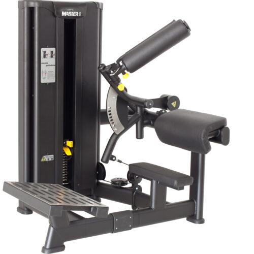 Maszyna na trójgłowy ramion siedząc tyłem. Konstrukcja urządzenia wykonana jest z płaskoowalnego kształtownika o wymiarze 125x60x3, dwukrotnie malowana metoda proszkową. Osłony stosu wykonane są z blachy. Maszyna posiada 9-stopniową pneumatyczną regulację położenia siedziska. Zastosowane siłowniki pneumatyczne pozwalają na łatwą regulację elementów przez ćwiczącego bez konieczności schodzenie z urządzenia. Selekcja obciążenia odbywa się co 5kg. Stos wyposażony jest w magnetyczny selektor obciążenia. Elementy tapicerskie są wykonane z pianki wtórnie spienianej o grubości 4cm i zostały dopasowane do anatomicznych kształtów ćwiczącego, co sprzyja komfortowi i bezpieczeństwu użytkowania. Elementy mające bezpośredni kontakt ze stopami wykonane są z blachy chromoniklowej wyposażonej w specjalne antypoślizgowe gumowane listwy zapewniające większą stabilność i bezpieczeństwo podczas ćwiczenia. Rączki wykonane z poliuretanu nie ulegającego degradacji w styczności z ludzkim potem. Mocowanie uchwytu – rączek jest za pomocą specjalnej obrotowej gałki zabezpieczającej linkę przed skręcaniem i podwyższający dodatkowo komfort ćwiczenia.