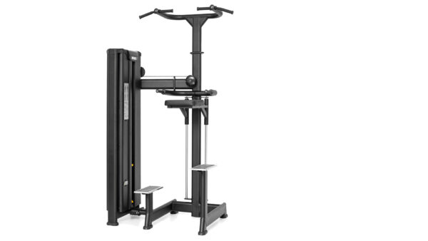 Dual-function strength machine replacing classic pull-ups on a bar and parallel bars, allowing for relieving the exerciser’s weight. Designed for exercising the latissimus dorsi, chest and arm extensors and flexors. The device’s construction is made of a flat oval section measuring 125x60x3, powder-coated twice. Specially profiled bar handles allow training of other parts of the above-mentioned muscle groups. The stack covers are made of profiled sheet metal. The stack is equipped with a magnetic load selector. The load is selected every 5 kg. The upholstery elements are made of 4 cm thick rebound foam and have been adapted to the anatomical shapes of the exerciser, which promotes comfort and safety of use. The handles are made of polyurethane that does not degrade in contact with human sweat. The elements in direct contact with the feet are made of chromium-nickel sheet metal equipped with special non-slip rubber strips ensuring greater stability and safety during exercise.