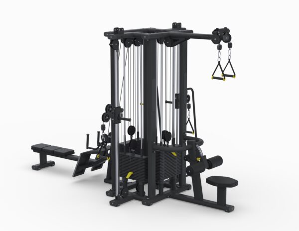 Multifunctional strength machine that allows 4 people to exercise at the same time, consisting of two rope stations and a lower and upper pulley. The device is designed to exercise the biceps and triceps muscles of the arms, the latissimus dorsi, the back muscles, the chest and the shoulder girdle. The tower structure is made of a flat oval shape measuring 125x60x3, powder coated twice. The stacks are equipped with a magnetic load selector. The load selection takes place every 5 kg. The handles are made of polyurethane that does not degrade in contact with human sweat. The upholstery elements are made of 4 cm thick rebound foam and have been adapted to the anatomical shapes of the exerciser, which promotes comfort and safety of use. The elements in direct contact with the feet are made of chromium-nickel sheet equipped with special non-slip rubber strips ensuring greater stability and safety during exercise. The presence of a 7-step roller pressure adjustment allows the device to be adjusted to the height of the exerciser. The standard equipment includes a thigh adduction and abduction station with a leg attachment handle. Greater stabilization during movement has been provided by the use of a double attachment of the bar for pulling from above and a double handle for pulling from below. The construction of the pull from below has been modified to provide greater stabilization of exercises.