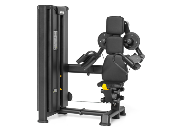 Strength machine designed for exercising shoulder muscles. It has a 9-step pneumatic adjustment of the seat position. The pneumatic actuators used allow for easy adjustment of the elements by the exerciser without the need to get off the device. The device structure is made of a flat oval section measuring 125x60x3, powder coated twice. The stack covers are made of profiled sheet metal. The stack is equipped with a magnetic load selector. The load selection takes place every 5 kg. The upholstery elements are made of 4 cm thick rebound foam and have been adapted to the anatomical shapes of the exerciser, which promotes comfort and safety of use. The handles are made of polyurethane, which does not degrade in contact with human sweat. An additional advantage is the unique load transfer system using biomechanically tested cams developed in cooperation with the Biomechanics Department of the Warsaw Academy of Physical Education, which protects against injuries resulting from muscle overload, and also ensures an increase in exercise effects of up to 30%.