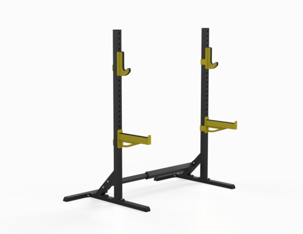 Stojaki przeznaczone do bezpiecznych ćwiczeń ze sztangą, których konstrukcja nośna wykonana jest z z kształtownika 60x60x3, a pozostałe elementy z kształtownika 60x40x2, dwukrotnie malowana metodą proszkową. Stojaki mają regulację położenia dźwigarów na gryf i zabezpieczeń co 5 cm. Dźwigary na gryf wykonane są z 20mm czarnej płyty PCV mocowanej między blachami, zabezpieczenie natomiast pokryte jest twardą gumą ochronną. Łącznik między stojakami wpływa na ich dużą stabilność. Minimalny rozstaw stojaków to 126 cm, a maksymalny to 174 cm. Dodatkową opcją jest możliwość zamocowania uchwytów na talerze.